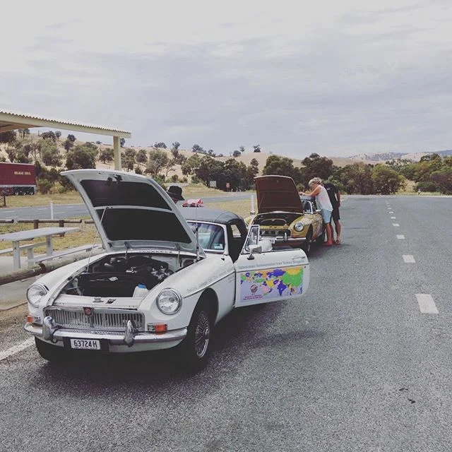 Lunch and a cool down for the cars in 35c heat.